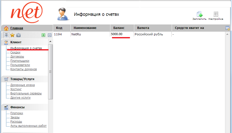 После поступления платежа по Авансовому счету, оплата будет зачислена на лицевой счет аккаунта и будет видна в разделе Клиент подразделе Информация о счетах