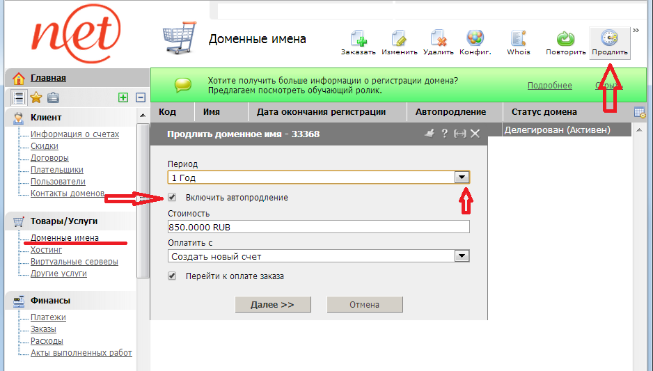! Внимание: Если вы зачислили платёж авансовым образом, то вам нужно либо вручную продлить существующие услуги, либо зайти в определенную услугу и указать "Автоматически продлевать на такой-то срок".
