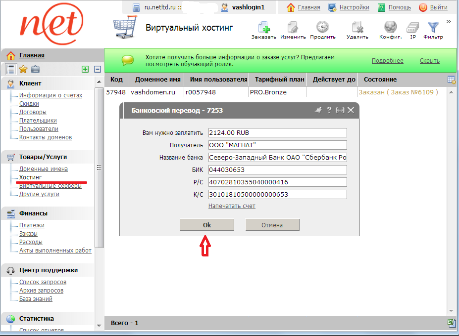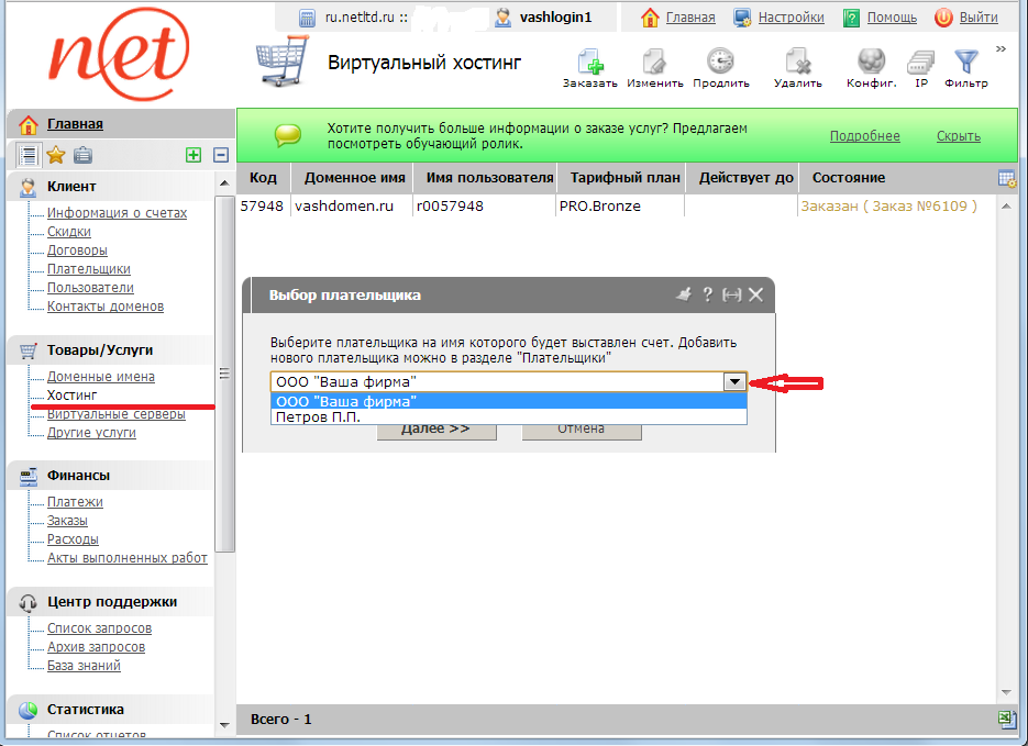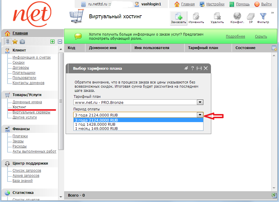 Если вы хотите заказать хостинг, то это можно сделать в вашем личном кабинете в разделе Товары/Услуги подразделе Хостинг.