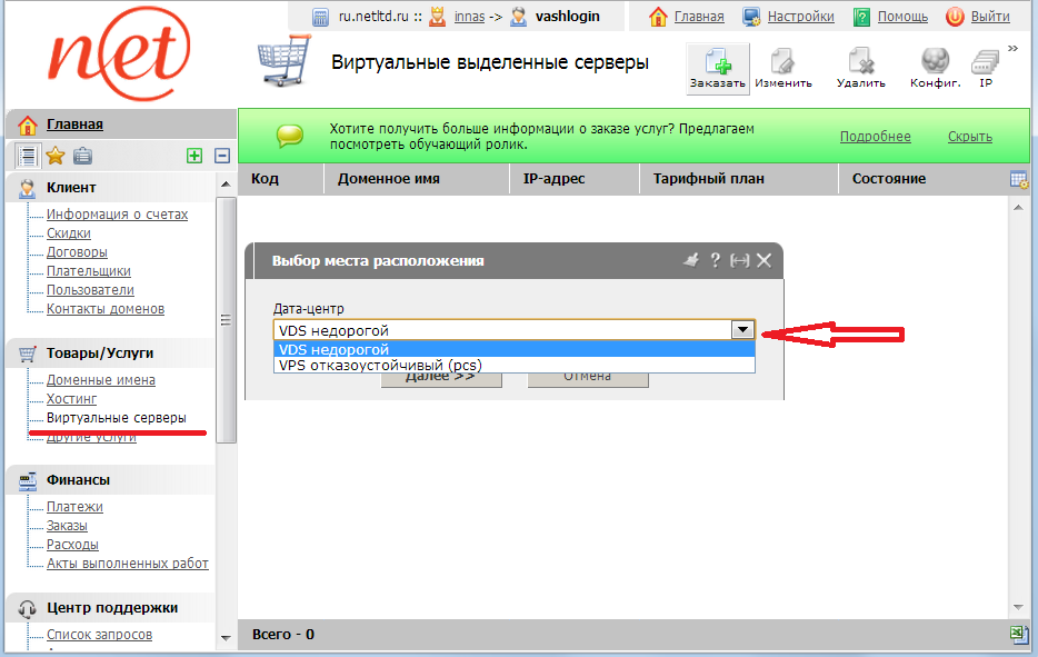 3. Выбор типа услуг (VDS или VPS) осуществляется выбором из ниспадающего списка нужного Дата-центр -а: