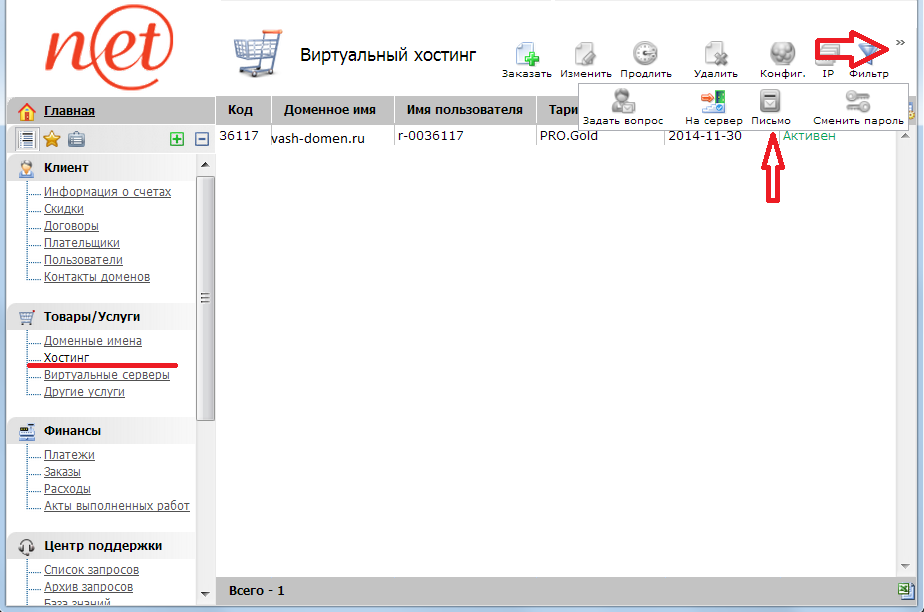 BillManager -> Товары/Услуги -> Хостинг |> Ваш–домен ::: "Письмо"