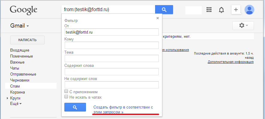 Для того, чтобы установить в Google фильтр для писем автоматически попадающих в спам, необходимо сделать следующее: