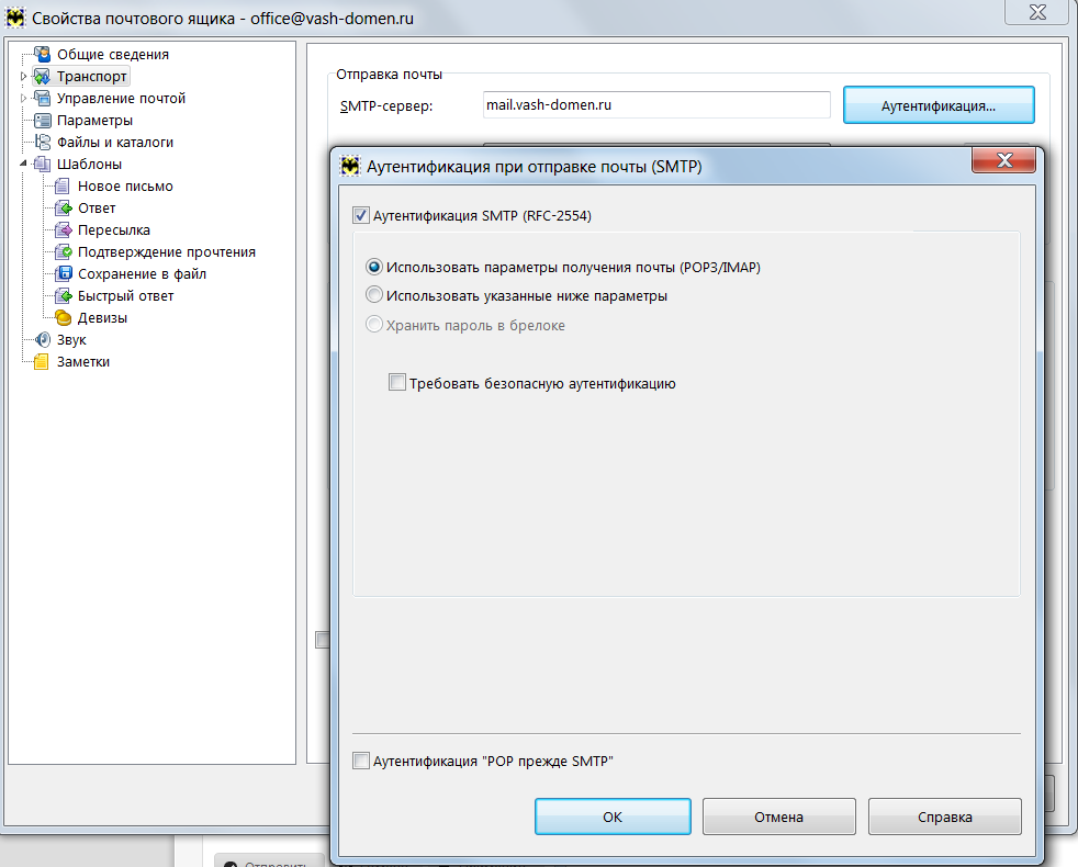 8. Нажмите на Аутентификация рядом с Отправкой почты и проверьте настройки