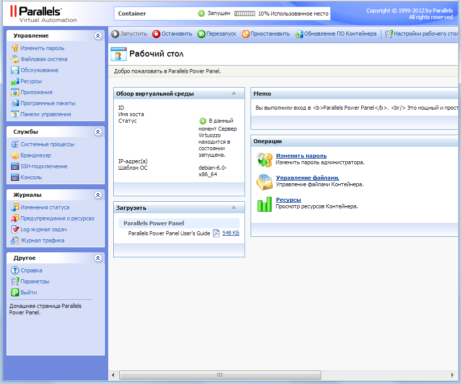 1. вам будет предложено ввести логин/пароль для входа в Панель управления Parallels Power Panel.